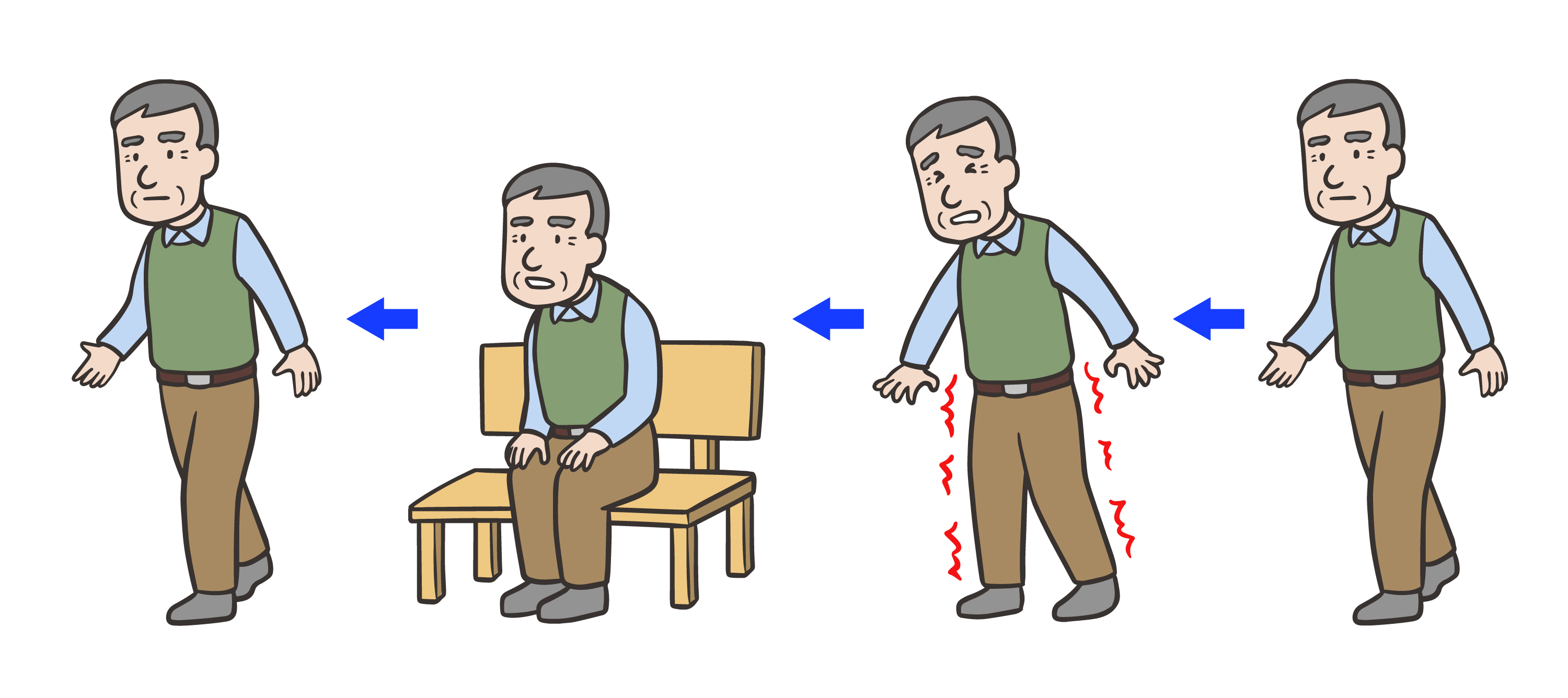 間欠性跛行という症状は、歩いていると下肢に症状がではじめ休むと緩和するもので